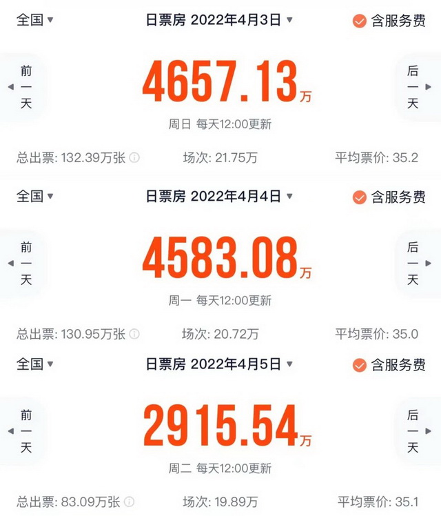 清明档(4月3日-5日)三天的单日票房分别为4657万、4583万、2916万。