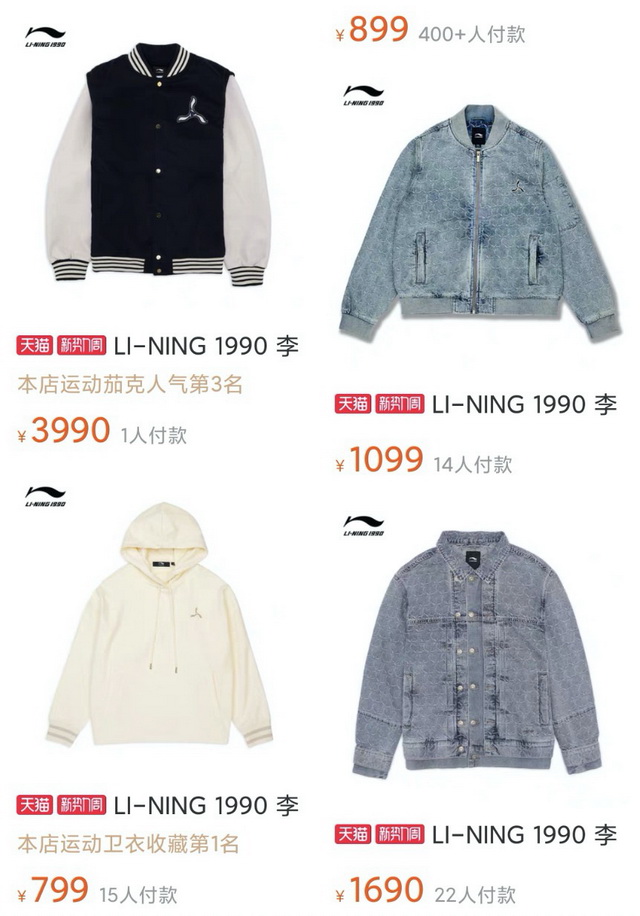 2021年底,李宁发布新产品线“李宁1990”,继续抬高品牌定价。记者观察其天猫旗舰店, “创魂系列女士中长款大衣”售价高达4599元,棒球服定价3990元,甚至一双中短袜,也高达110元。而按照销量排序下,前列商品均是肖战同款。