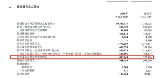 李宁的广告及市场推广开支达17.79亿元,较2020年的12.795亿元,涨近5亿元,涨幅和营收增速几乎并行。安踏广告及市场开支占收入比重也从2020年的10%,来到了12.4%。但与此同时,各国产运动品牌的研发占收入比重,仍长期停留在约2%的水平,增速也低于收入增速。
