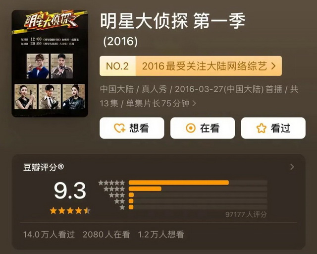 彼时,国内明星推理真人秀还处于蓝海,《明侦》以小博大迅速开拓了推理综艺市场。在点燃观众推理热情的同时,也收获了一批忠实粉丝,有人在豆瓣中创建“明星大侦探”小组,便于同好讨论。