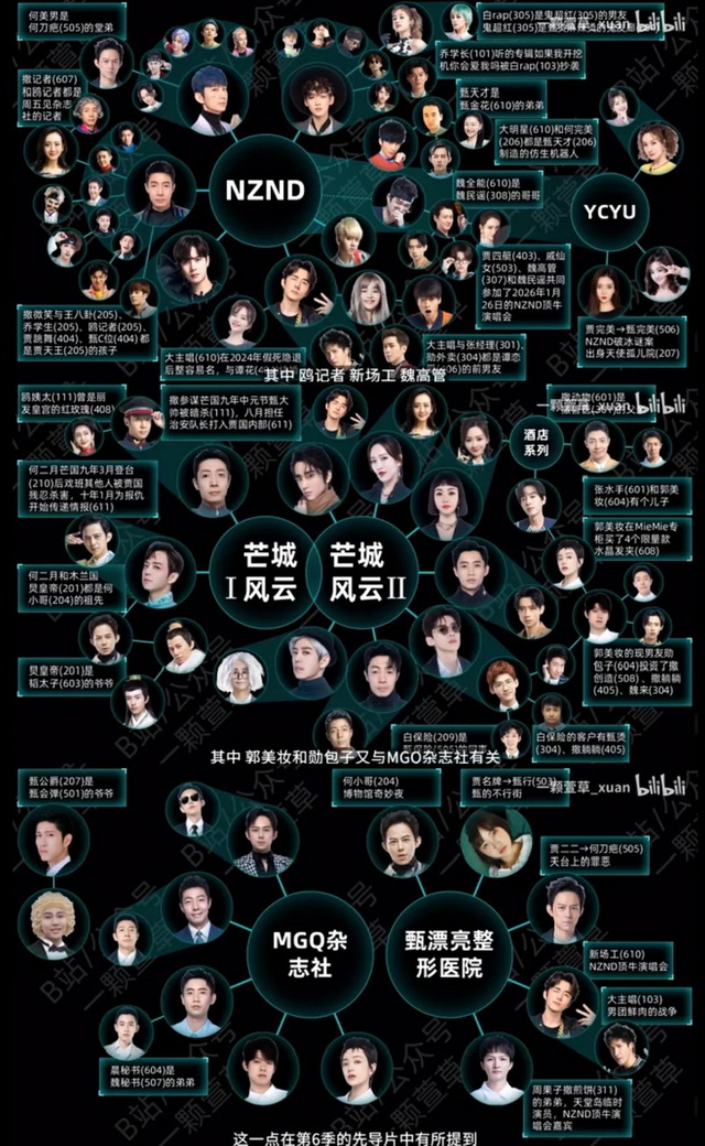《明侦》区别于其他真人秀节目“单元剧”的模式,《明侦》的案件之间充满联系。随着节目期数越来越多,有些案件甚至形成了系列。比如,NZND男团系列、《冲不上的云霄》系列、《都是漂亮惹的祸》系列等等。