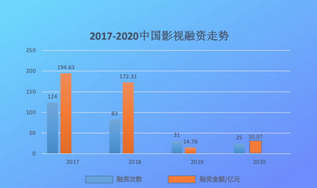 《中国电影投融资发展报告(2021)》显示, 2017年至2020年,影视行业融资事件数量依次为124次、83次、31次和25次,融资总额分别为194.63亿元、172.31亿元、14.76亿元和30.97亿元。