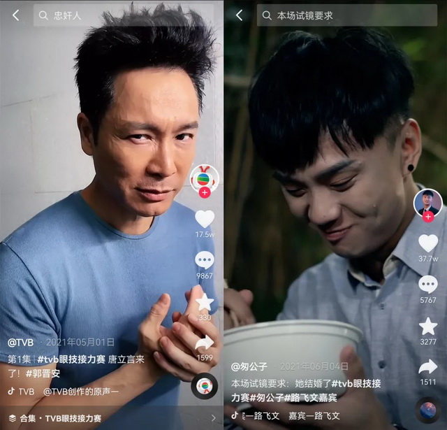 虽然目前TVB官方抖音已经积攒了1087万粉丝发起的挑战,但看起来还需要找到更合适的玩法。官方曾推出“TVB眼技接力赛”的话题,让旗下演员都来发布注诸如“秒变反派”“她结婚了”等演技片段视频。