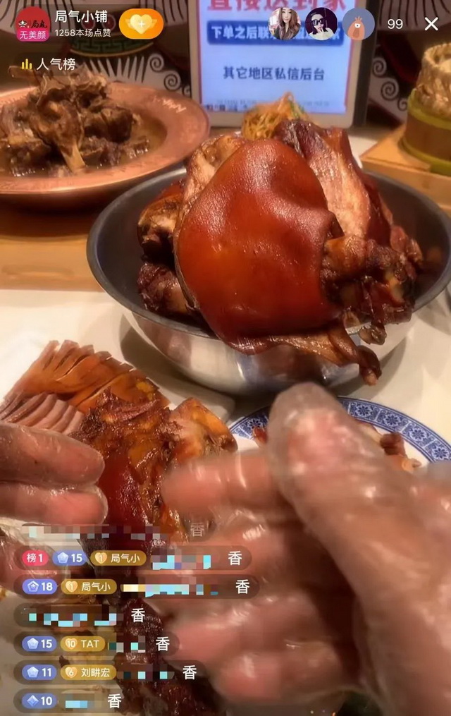 5月20号上午10点30分,“局气小铺”的抖音直播间准时开播。这是店里第一锅肘子出锅的时间,主播一边将镜头对准热气腾腾的肘子,一边跟直播间里的粉丝们互动,“老规矩,第一个肘子咱们送粉丝,我请您吃。”