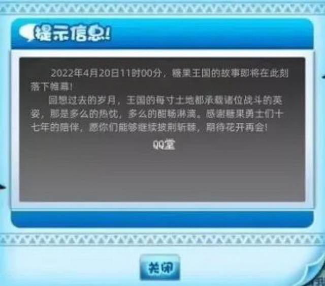 一如过去自己手动修补丁,做虚拟器,列黑名单一样,QQ堂玩家们自己做了一个更为正式的告别:“糖果王国的故事即将在此刻落下帷幕……感谢糖果勇士们十七年的陪伴,愿你们能够极限披荆斩棘,期待花开再见。”