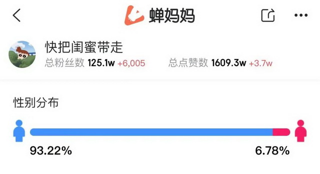 通常,以女性之间的互动为主打内容的创作视频,受众也多以女性为主,宫斗剧即是如此。但也有例外。账号“快把闺蜜带走”在抖音平台有约125万粉丝,视频主角米抠长相可爱,身材娇小,一口四川话,是一位在家里的串串店帮忙的无业女孩,日常是偷吃串串,及与老妈斗智斗勇。蝉妈妈数据显示,该账号的视频观众中,男性比例高达93%。
