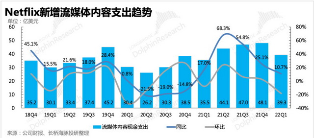 单纯内容驱动的平台其窘境便在于此,营收受爆款内容影响大,且在用户阈值不断升高背景下,内容投入成本需要不断升高。然而据长桥海豚投研统计,截至一季度末,在业绩与疫情双重压力下,奈飞整体内容资产规模312亿,环比新增投入大幅萎缩。