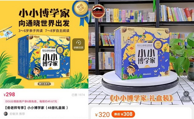 首先在价格上,直播间观众已经形成了“低价抢购”的习惯,观之俞敏洪直播间图书价格,与电商平台相比优势并不明显。以《小小博学家》(48册礼盒装)为例,俞敏洪直播间价格为298元,而在某电商平台308元也能到手,没有竞争力的价格优势自然无法吸引到观众。