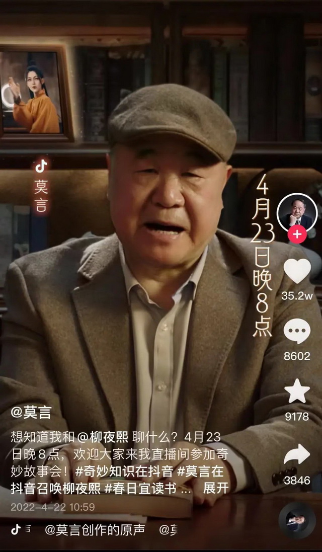 比如今年4月,柳夜熙就在抖音与莫言进行了梦幻联动,以直播的方式出现在了莫言的文学世界当中,为我们带来了一场虚拟科技与奇妙故事的碰撞。
