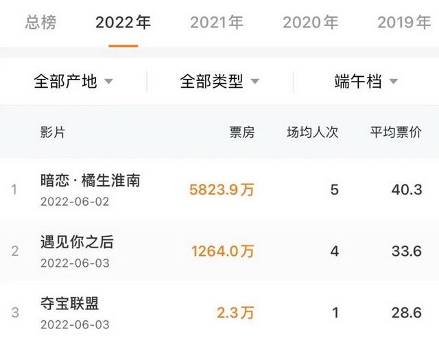 具体而言,档期票房冠军为端午档新片《暗恋·橘生淮南》,共收4825万票房,与亚军《坏蛋联盟》的4190万差距很小,且后者还是已经上映了一个月的老片。而相比五一档同一类型的《我是真的讨厌异地恋》,《暗恋·橘生淮南》在有IP优势和营业影院数量更多的前提下,档期内平均单日票房却反倒更低。