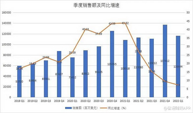 该季总销售额1164亿美元,相较于去年同期的1085亿,增长7.2%,连续两季增速低于10%(2021年第四季度销售额同比增长9%),也是20年以来的最差增速。