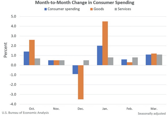 2022年2月,经通胀调整,美国商品和服务消费支出环比仅增长0.2%,3月未经通胀因素调整的消费支出环比增长1.1%,但美国经济学家预期通胀调整后,或为下降0.1%。