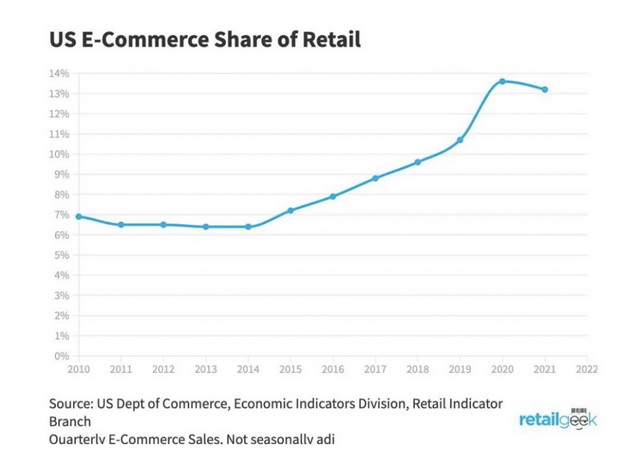 美国商务部数据,2020年美国电商渗透率为13.6%,2021年降至13.2%。当然,渗透率即便回落,相较于疫情前2019年的10.7%增长仍然明显。同时下滑主要系美国疫情常态下,实体零售业的复苏:数据显示2021年美国线下零售额同比增长18.5%,而电商同比增长14.2%,线下增速首次超过线上。