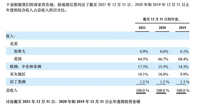加拿大跨境电商Shopify同样让亚马逊难以忽视,2021年其商品交易额达到1754 亿美元,同比增长46.7%。虽未披露GMV细分市场,但从营收中可看出,邻居美国贡献不俗,收入占比达64.5%。