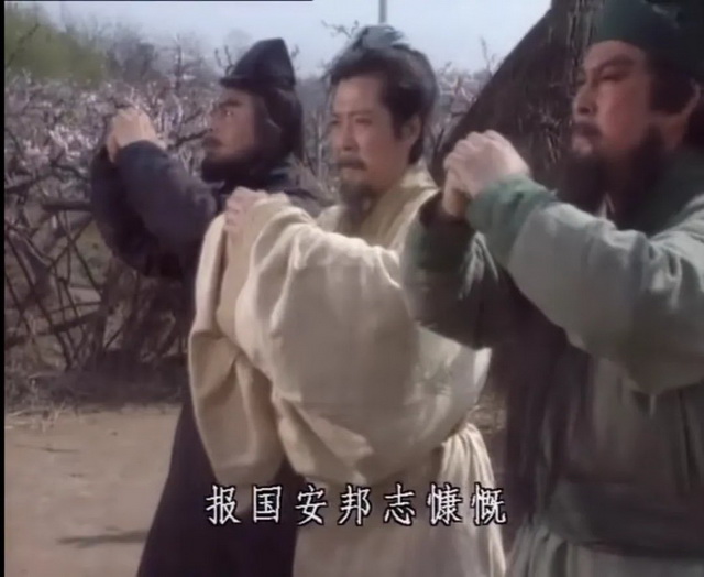 四年,是央视四大名著系列剧集平均的音乐制作年份,往往是早在开机就创作,杀青后才收工,中间跟着剧组随时调整,音乐也是拍摄的一部分。1991年3月,无锡拍摄基地的桃园,刘关张三位演员化好妆,换好戏服,蔡导喊:“放音乐!”刘关张三人就在刘欢演唱的《这一拜》中拜天地、序长幼。