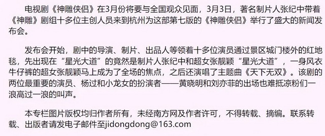 这“反常”的流程,看中的就是“超级女声”的热度。《神雕侠侣》发布会上,率先走红毯的不是主演黄晓明和刘亦菲,而是制片人张纪中和张靓颖,现场张靓颖粉丝的尖叫声也是最高的。