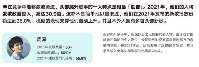 缺点则是市场容易趋于保守,重复使用歌手。周深上次出原创专辑还是2019年,但据腾讯音乐数据研究院统计,周深2021年一共出了50+首歌,其中多为影视作品OST。这也并非是这几年的特色,而是市场化后的必然,韩磊团队就曾打算在2014年申报吉尼斯世界记录,因为韩磊到当年为止,已经唱过七百多首影视剧和专题片的曲目。