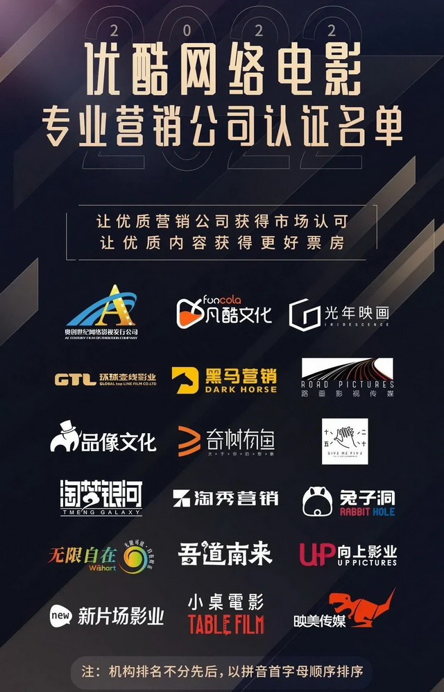 据悉,首批营销公司实行邀请制,以近3年有过全网票房过千万影片营销案例的公司为范围筛选。根据名单,首批共有18家公司进入优酷网络电影专业营销公司认证名单,打造了《开棺》等爆款的奇树有鱼便是其中之一。在此基础上,该认证还将持续面向全行业开放,与此同时,优酷也将为专业营销公司提供更多数字化能力和资源技术的支持。