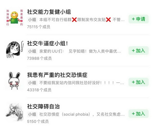 在豆瓣平台,以“社交”为关键词的小组多达上百个,其中“社交能力复建小组”“社交牛逼症小组”“我患有严重的社交恐惧症”小组组员多达万人。组员们在小组中发帖,探讨各自遇到的,无法解决的社交难题。