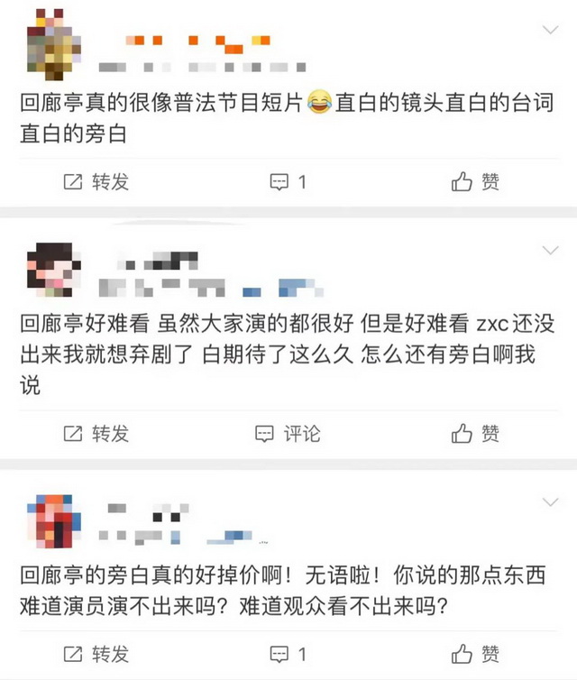 在《回廊亭》的豆瓣页面,有不少观众对该剧密集出现的旁白表示了不满,甚至有人将“在剧集里使用旁白”和“创作者没能力”画上等号。这些观点虽然有些武断,但仍能反映当下观众对剧集质量的多维度审视。