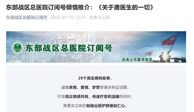 《关于唐医生的一切》大结局上线前的中午,东部战区总医院微信公众号撰文推荐了这部剧,一家医疗水平能排进全国前50的医院,就这样成为了这部剧的“自来水”。