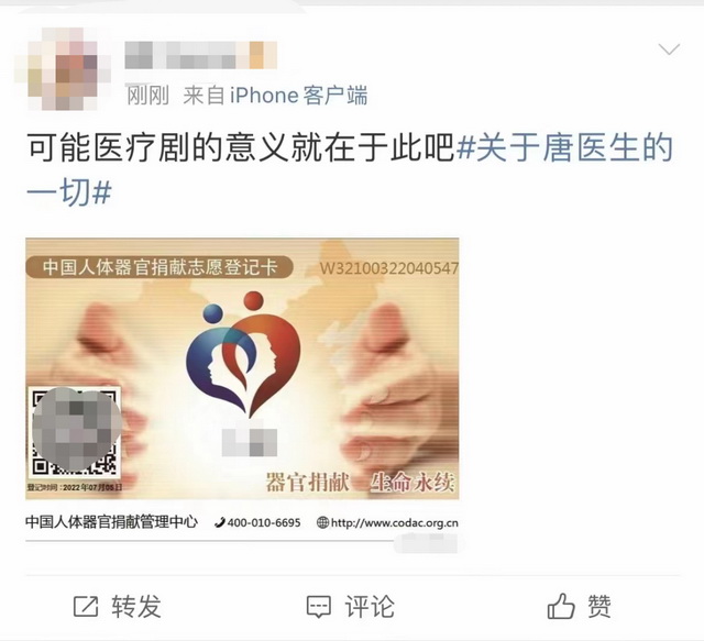 更让主创们震撼的,是王雪纯离世的剧情更新后,有不止一位网友在微博表示,已经去登记了器官捐献,并晒出了志愿卡相关信息。