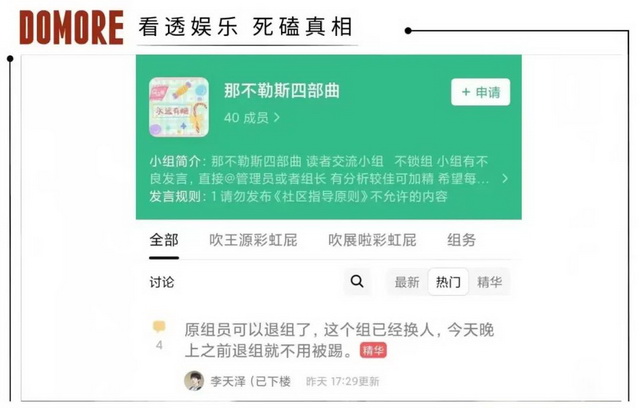 7月20日晚,有豆瓣用户在小组小象乐园发帖表示,原“那不勒斯四部曲”小组突然之间发生了爆炸型人员动荡。原组长不再参与管理小组,新任组长和管理员则手动将7000多位组员全部踢出。讨论文学的“那不勒斯四部曲”小组转眼之间变成了时代少年团的粉丝主阵地。
