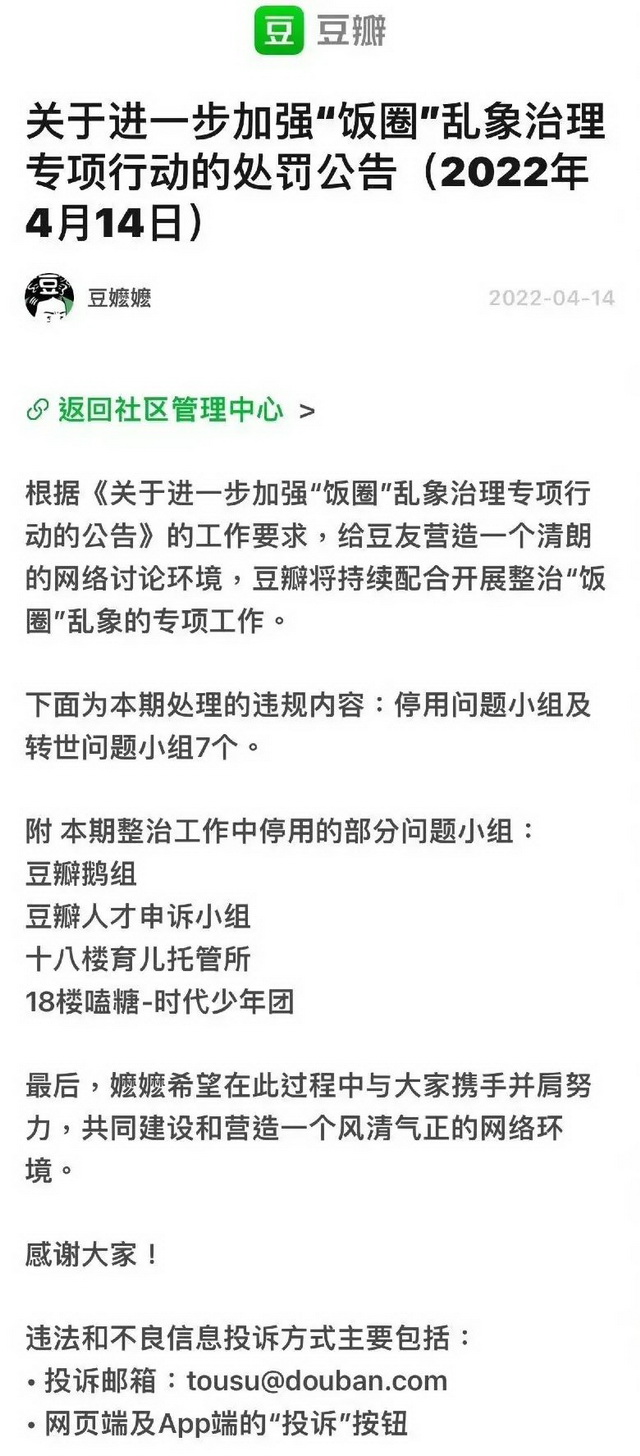 事实上,在一波又一波的清朗之后,豆瓣对娱乐类内容的管理规范进一步加严。豆瓣最为出名粉丝数也最多的娱乐大组“豆瓣鹅组”直接被永久封禁,而其他小组也依据其影响力也受到了程度不一的处罚。