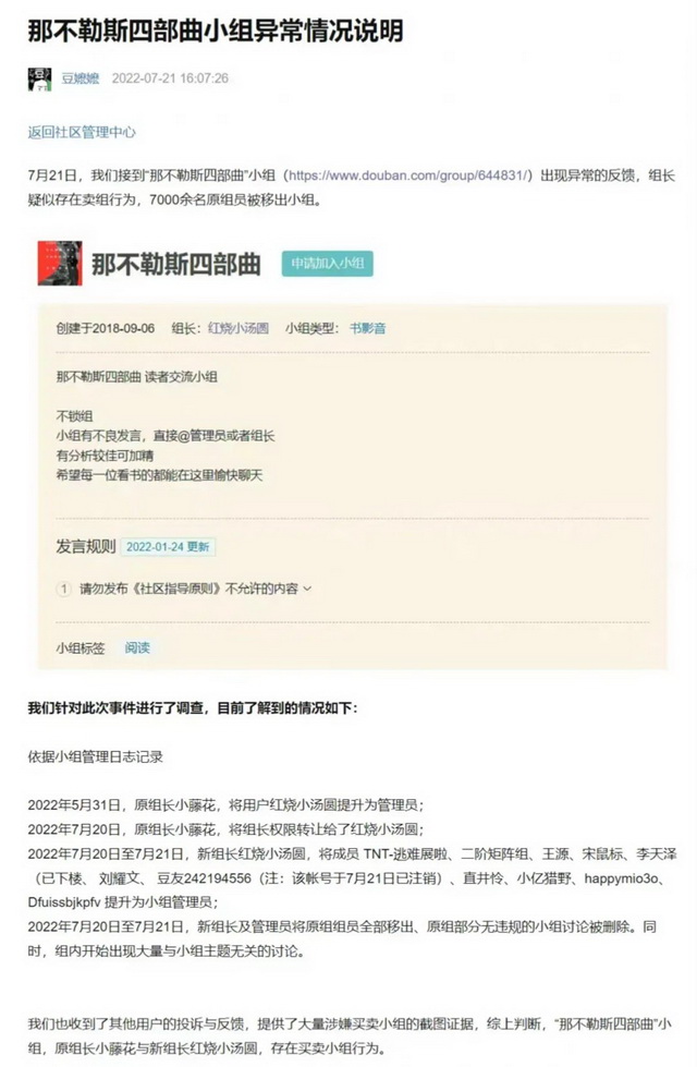 据豆瓣官方信息,5月31号,原组长将新组长提升为管理员,此后一个月内未有任何动作。7月20号,原组长“让位”给新组长,在此之前发布了“退组声明”,而新组长迅速任命了一批骨干成员,并开展了小组大清理活动。