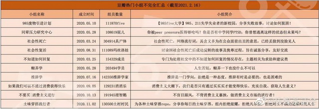 一方面对既有的小组进行处置,另一方面,豆瓣对新小组的建立也加强了审核。一个显而易见的结果是,过去几年,几乎每段时间都会有一个新的豆瓣小组凭借其独辟蹊径的话题引爆舆论场,譬如小组“985废物引进计划”和“小镇做题家”,“糊弄学”“推辞学”乃至“油腻传达教学”。
