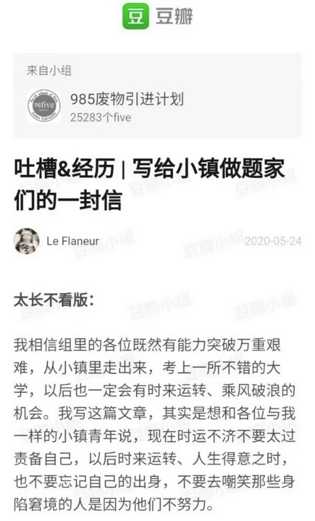 最后,小组既承担了让同好互相交流的“私域”功能,同时又有良好的管理机制可以保存组员发布的帖子,最终集合成具有影响力的文化单元;又能够凭借其小组成员的交流产生公域价值,用户之间的讨论达到一个爆点后,最终能形成集体性事件。“小镇做题家”词语的流行和泛化,最初的源头正是豆瓣小组。