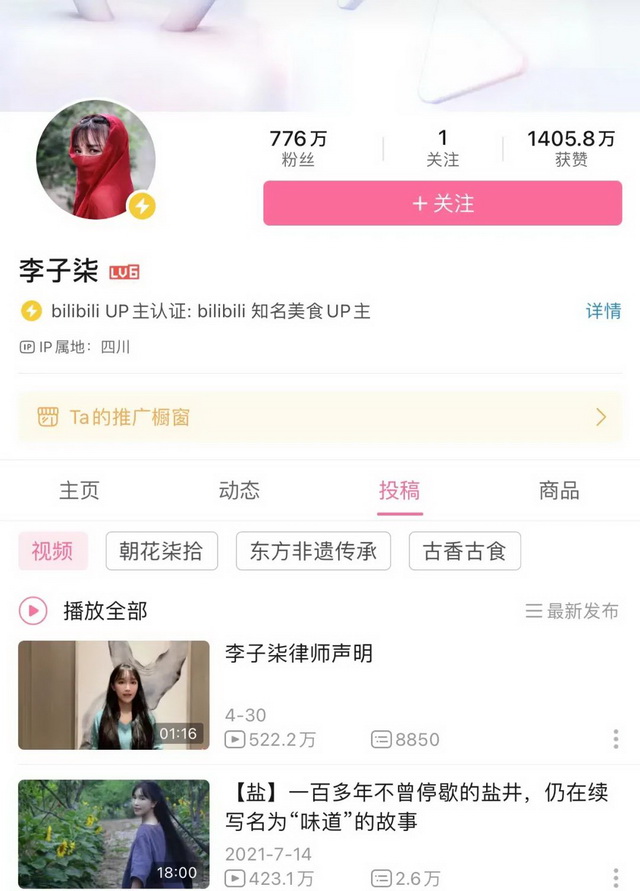 这对她也并非没有损害。从去年7月至今,李子柒的微博粉丝从2770万下滑到2670万,B站粉丝从近800万下滑到776万,唯一粉丝量提升的是油管账号,停更的这段时间里,李子柒的follower还多了一百多万。