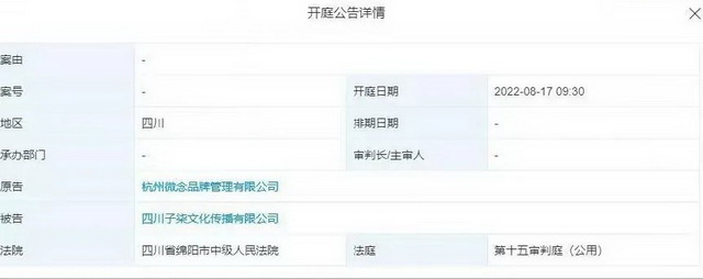 但官司还在持续打下去,据企查查数据显示,杭州微念从2020年开始,便多次起诉李子柒持股49%的四川子柒公司,最新一次法院公告的开庭时间,是8月17日。