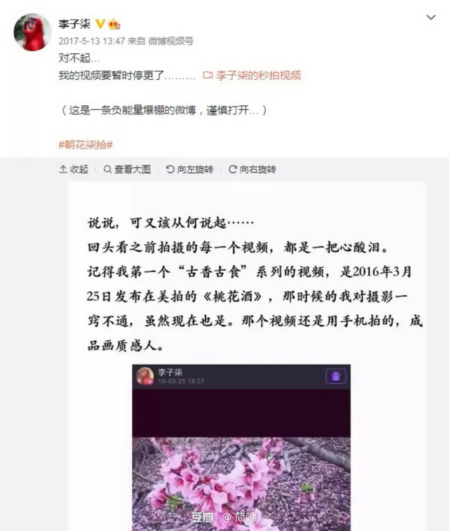 与现在李子柒精致、优美、考究的视频相比,这条视频显得极为单纯,唯一的亮点是,李子柒身着长裙走在桃花树里,BGM是明代诗人唐寅的《桃花庵歌》。这在当时得到了美拍CEO的点赞,还被美食大V转发,一下子火了。