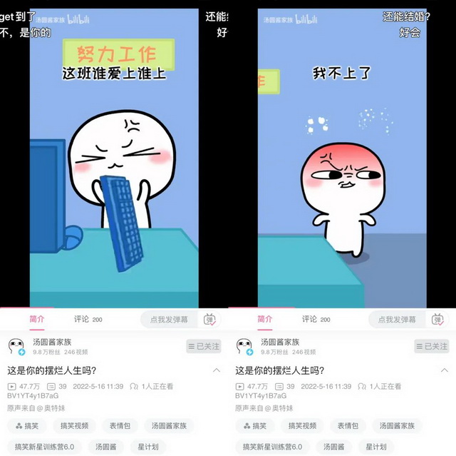 第一种摆烂段子特别容易引起观众的共鸣,因此在各大平台随处可见,比如B站up主@汤圆酱家族制作了好几期有关摆烂的视频,在“这是你的摆烂人生吗?”这期视频中,它生动刻画了人生不同阶段的摆烂状态:上学时因为学不会觉得自己不是学习的这块料,上班时则会出现“这班谁爱上谁上,我不上了”这种想法,而在老了后则会产生“谁爱活谁活,我不活了”这种思想。