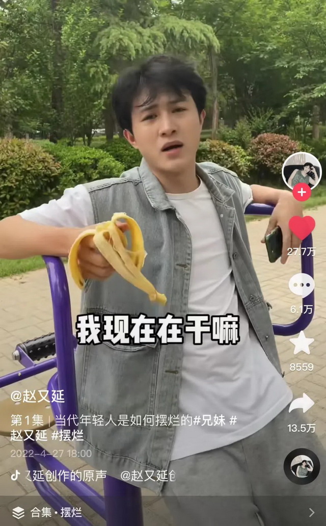 而在抖音上,@赵又廷制作了“当代年轻人是如何摆烂的”这个合集,在第一集中,他吃着香蕉靠在健身器材上很是享受,一个女生上前询问他不上班在这干嘛,他则反问上班干什么?女生回答“上班赚钱”,他又反问赚钱干嘛?女生又回答“赚钱买房”,他又反问买房干嘛?女生又回答“娶老婆享受人生”,他又给出了终极一问“那我现在在干嘛”?在几个回合之后,两人又绕回了原点,女生也成功被带偏。