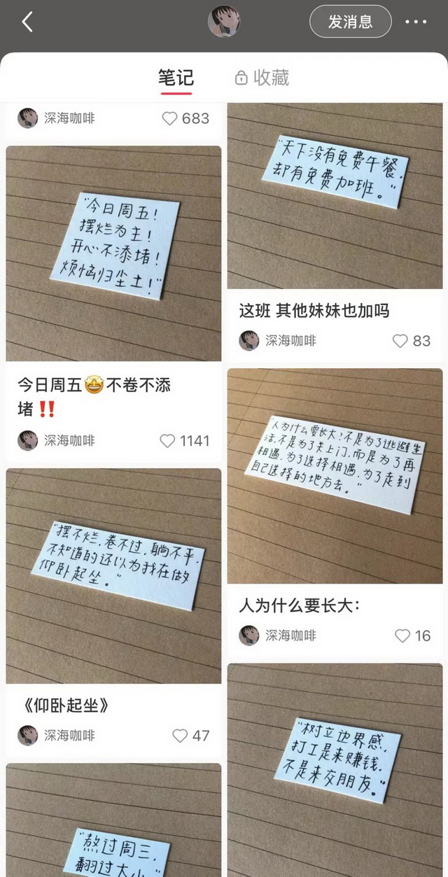 而有的博主则是将摆烂语录用手写这种比较治愈的形式展现出来,小红书博主@深海咖啡则是其中的一个,在她的账号主页,与摆烂相关的内容随处可见,比如“薪病难医,唯有摆烂”,“装模作样上班,全心全意摆烂”,“摆烂一时爽,一直摆烂一直爽”……