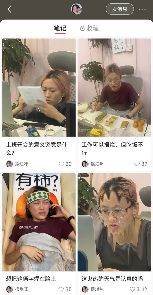 除了摆烂段子和摆烂语录,也有一些博主记录自己的摆烂日常,小红书博主@摆烂咪在自己的主页上写到“唯有摆烂,方为王道”,而她经常分享自己工作时画风清奇但又真实的照片,午休睡醒后魂不守舍的模样以及上班太累瘫坐在椅子上动作都是她的创作素材,她也会用摆烂言论作为自己的标题,比如“老板不在,员工起飞”,“只要心在远方,你就在远方”,“这个世界上什么时候才能没有公司”等等。