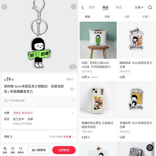 对于摆烂语录博主而言,通过摆烂语录与表情包有机结合的方式能够赋予自己的内容一定的商业价值,就像@内在小孩innerchild就很好的将自己的内容实现了商业化,他将表情包制作成亚克力钥匙扣以19.9元的价格在小红书上售卖,除此之外,他还将表情包印在手机壳、帆布包、水杯等物品上制作成周边产品,不过目前的销量并不算高,每个产品只有几十个销量。