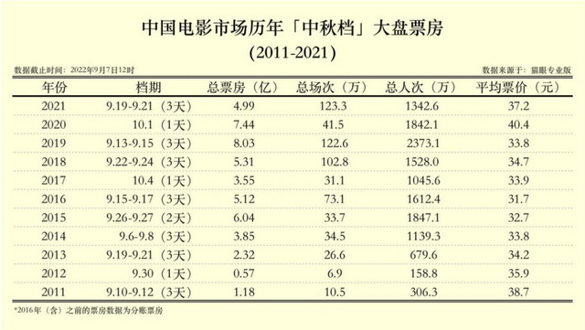 又是一个自2015年来最差的档期成绩(中秋与国庆假期重合的年份除外),在今年走过清明、端午、五一档之后,这样的场面已经见怪不怪。不过,暑期档的回温对市场仍有提振作用,尽管比去年的中秋档下滑不少,但跟上半年的小长假档期(清明1.2亿、五一3亿、端午1.8亿)相比,已经提升不少。