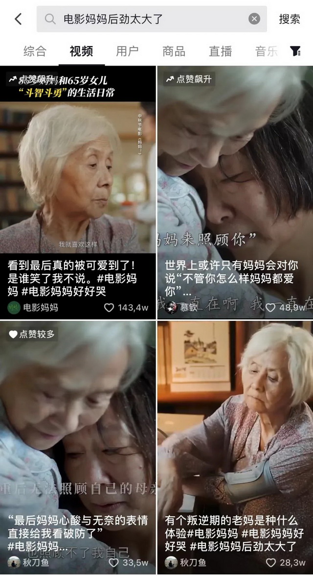 这些高口碑影片已经有了长线作战的先天基础,且表露出了一定的迹象。比如,档期的最后一天,抖音话题#电影妈妈后劲太大了#最高时登上了抖音热搜第五的位置,这与当时《隐入尘烟》出圈时的话题如出一辙,能否再度起效尚未可知。