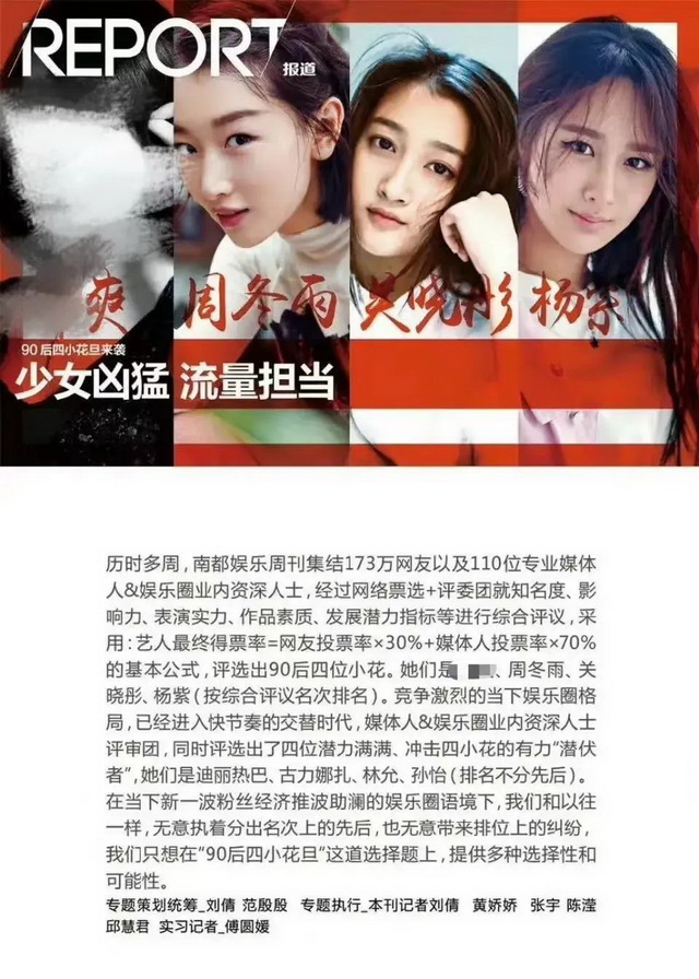 2016年,《南都娱乐周刊》按照知名度、影响力、表演实力、网友投票等指标,评选出了“90后四小花旦”,周冬雨、杨紫和关晓彤都在此列。