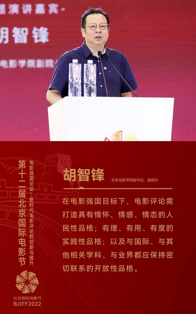 北京电影学院副书记、副院长胡智峰教授提到,当前中国影视评论应努力提升三种品格——人民性品格、实践性品格与开放性品格。在开放性品格中,胡智峰教授强调,应与从事一线影视行业的人多接触多沟通,“他们的实践经验不见得有很深的道理,但是他们的深刻的体验和体会不见得是用科学语言表达出来的,但是对于评论者而言是最鲜活的素材和评论的资源。”