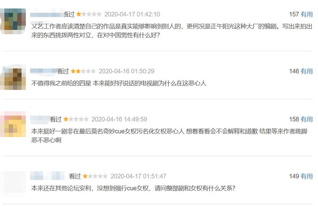 《我是余欢水》是舆论的爆发点。剧中主角团被绑匪绑架,绑匪让大家说出放他们的理由,其中一个女生说“肯定放我啊哥哥,我是女的,我是弱势啊”,而绑匪回呛道:“别来着套,男女平等,你们天天哭着喊着女权,我给你呀!”这段对话,刺出了该剧不少豆瓣一星评论。