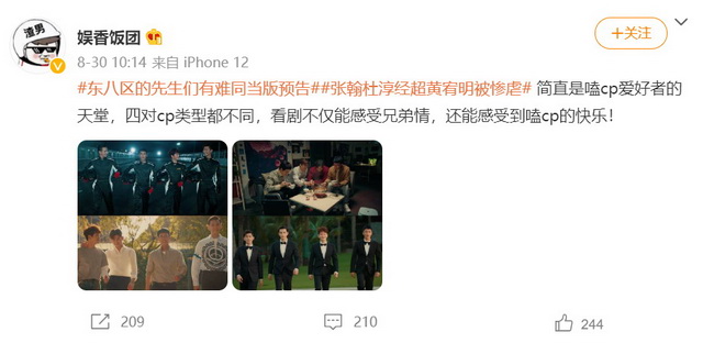 最近播出的男性群像剧《东八区的先生》,在发布预告当天,营销号联动发布的内容都是“看剧不仅能感受兄弟情,还能感受到嗑CP的快乐”。