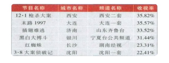 这些剧在命名方式上也十分“朴实”,如《9.18大案侦破纪实》《12.1 枪杀大案》《大案侦破12警示录》等。当时,国家广电总局总编室副主任王丹彦就提到过,“现在只要社会上出现大案、要案、重案,很多制作单位便会蜂拥而上,争抢拍摄权。”
