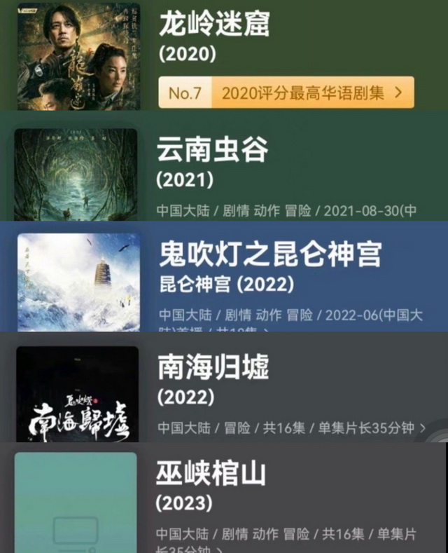客观来说,从投出产出、剧集质量本身来说,“鬼吹灯”仍然有不小的上升空间,然而这种头阵、打样的效应,在整个国产剧集的发展当中不可忽视。在“铁三角”一同冒险到第三个年头的2022年,“系列化改编”这个过去难得一见的现象,频繁出现。