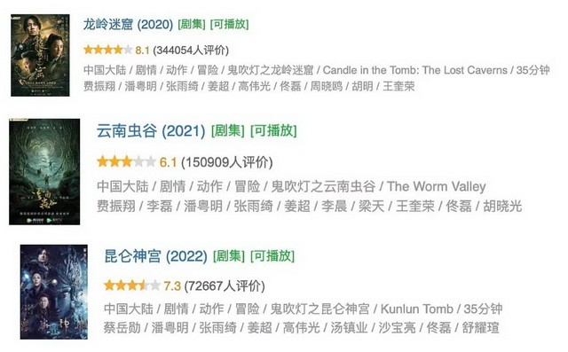 毒眸(ID:DomoreDumou)统计了三部《鬼吹灯》播出期间,在云合数据每日舆情榜TOP10以及霸屏榜TOP10的入榜次数后发现,三部作品的入榜次数呈明显的递减状态。三部作品的豆瓣评分人数,也越来越少,分别为破34万、破15万和破7万。