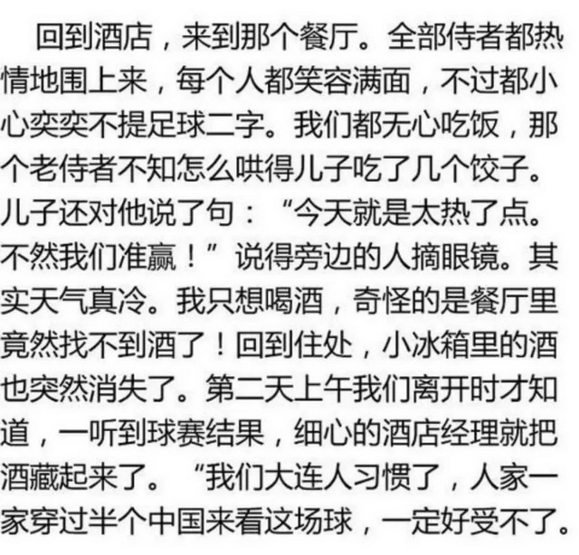 文章的作者叫老榕,是福州人,他的儿子是一个球迷,为了满足儿子观看比赛的愿望,特地乘坐飞机从福州去往大连,结果亲眼目睹了中国男足在大连金州的关键失利。