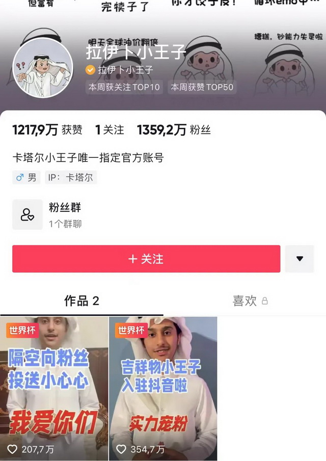 最先感受到这种红利的,是来自于卡塔尔的15岁小王子。不久前的世界杯揭幕战上,卡塔尔对战厄瓜多尔,结果最终0:2失利。赛场上的卡塔尔小王子忍不住掀起自己的头巾,表情呆滞地质疑场上发生的一切。这个场景随后被媒体捕捉到并上传到中国互联网,由于表情酷似卡塔尔世界杯的吉祥物,卡塔尔小王子在抖音迅速被追捧并开始入驻抖音。